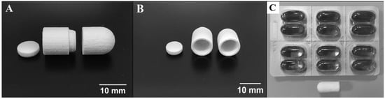 Multi-compartment preform tablet. (A) Side view of the three pieces constituting the preform tablet. From left to right, top cap, top compartment, and bottom compartment. These pieces were manufactured by powder-bed 3D printing using as binder DI water with 5% ethanol and 0.25% Tween 80. The powder utilized for their construction was calcium sulfate. Each of the two wells have a 250 µL capacity. (B) Front view of the preform tablet fabricated. (C) Comparison between the assembled version of the preform tablet and commercially available gel capsules.
