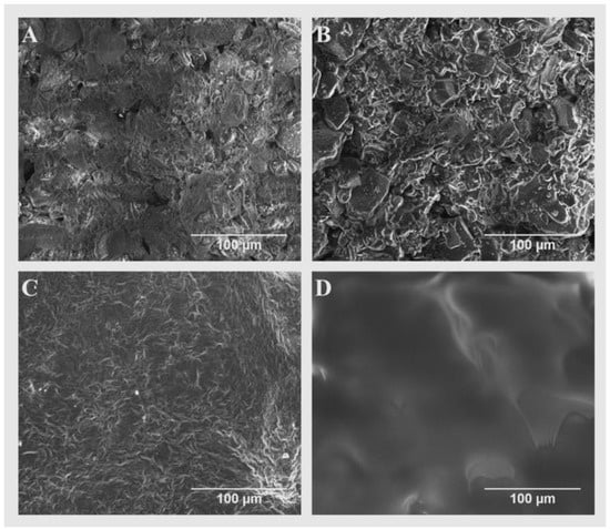 The SEM micrographs of the untreated and coated preform tablet surfaces. (A) Surface of untreated preform tablet. (B) Bottom compartment infused with a 10% E-100 in acetone solution. (C) Top compartment infused with a 15% PEG (35 kDa) in acetone solution. (D) Inner section of the top compartment preform tablet, brushed with a 20% E-100 in acetone solution.