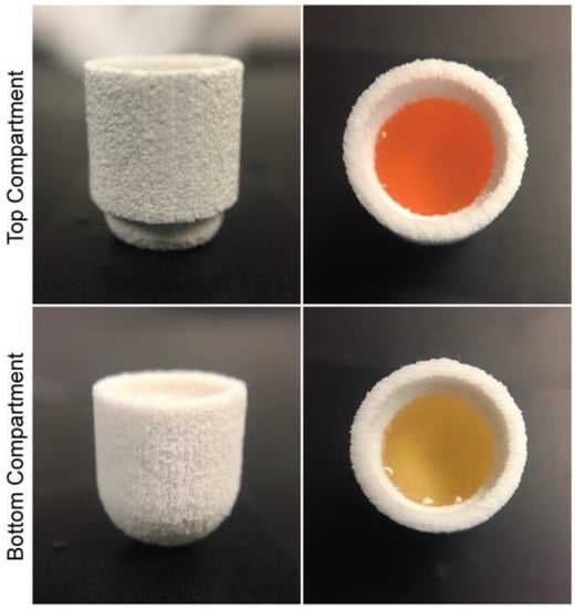 The hyaluronic acid-based hydrophilic bioink was loaded with lisinopril at a concentration of 40 mg/mL. Two-hundred-and-fifty µL of this formulation were dispensed into the bottom compartment of the preform tablet and further exposed to visible light for 2 min, to induce gelation of the photocurable bioink. Likewise, the PEG-based hydrophobic bioink was loaded with spironolactone at a concentration of 20 mg/mL. One-hundred-and-twenty-five µL of this formulation were loaded into the top compartment of the preform tablet and exposed to visible light for a period of 1 min (Figure 8). Once the bioinks were polymerized, the two compartments were attached, and the small cap was placed to seal the top compartment, completing the oral dosage form. The tablet was immersed in a beaker containing 500 mL of dissolution medium, conditioned at 37 °C and stirred at 60 rpm. Aliquots were taken after 0.5, 2, 4, 6, 8, 12, 18, and 24 h of dissolution and their drug concentration was assessed through HPLC analysis. The results obtained show a dual sustained release of lisinopril and spironolactone in a period of 24 h (Figure 9). The preform tablet dissolved almost in its entirety with the exception of the lower part of the top compartment, completely exposing the gels to the dissolution medium (Figure S3). Lisinopril experienced faster drug release kinetics, when compared to spironolactone. This result can be explained by the differences in the microarchitecture and composition of the gels. The hydrophilic formula has over 90% of water content, facilitating the diffusion of lisinopril, a hydrophilic compound, into the dissolution medium. Moreover, the hydrogel has a WHANB of only 3%, allowing small molecules to easily diffuse through the polymerize matrix. The hydrophobic formulation has a higher polymeric content (WPEGDA = 30%) resulting in a mesh size of ~11 Å []. Naproxen and ibuprofen have a hydrodynamic radius of 3.77 Å and 6.80 Å [], respectively, and molecular weights of 230.26 Da and 206.29 Da. It can be hypothesized that the hydrodynamic radius of spironolactone is close to the mesh size of the polymerized hydrophobic gel (11 Å), since it has a significantly higher molecular weight than naproxen and ibuprofen, model drugs previously utilized under similar experiment conditions []. This would explain the slower release profile observed with spironolactone, since diffusion of the molecule through the gel matrix would be impeded. The use of a higher PEGDA molecular weight for the fabrication of the gel could result in larger mesh sizes and consequently, enhanced drug release kinetics.
