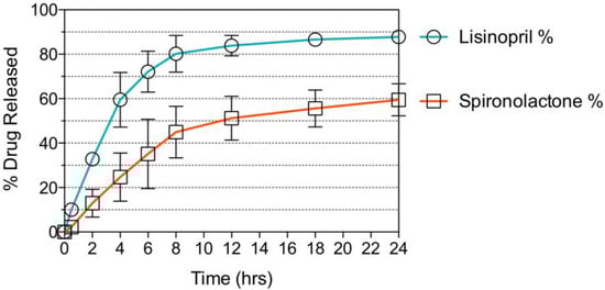Dissolution test of polypill. A sustained release profile was achieved for both APIs. Around 90% of the lisinopril loaded was release in a period of 24 h, releasing most of the drug within the first 8 h. Above 60% of the spironolactone loaded was released in a period of 24 h.