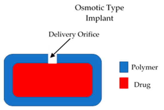 These types of implants have a positive driving force to control the release of drugs from the device [15]. Therefore, they present a higher degree of control of drug release. However, due to their complexity they present higher development costs [15]. The majority of the implants in this category are electronic systems made of metallic materials. However, to remain within the scope of this article, only polymeric implants will be described. Dynamic drug delivery implants are mainly pump type implants. The main type of polymeric active implants are osmotic pumps. This type of device is formed mainly by a semipermeable membrane that surrounds a drug reservoir [15], as shown in Figure 2. The membrane should have an orifice that will allow drug release. Osmotic gradients will allow a steady inflow of fluid within the implant. This process will lead to an increase in the pressure within the implant that will force drug release trough the orifice. This design allows constant drug release (zero order kinetics). This type of device allows a favourable release rate but the drug loading is limited [15].