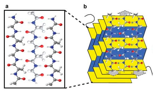 An illustration of (a) a three chain silk sequence composed of carbon (gray), nitrogen (blue), oxygen (red) and hydrogen (white); (b) 3-dimensional β-sheet of silk. Reproduced with permission from [100].