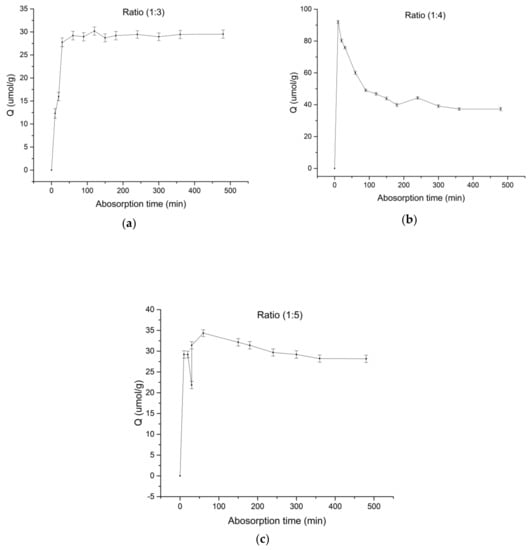 In accordance with Section 2.3.4, three molar ratios of the imprinted polymers were selected to determine the adsorption equilibrium time, the results of which are shown in Figure 2. The a, b, and c ratios of SPD–MAA are 1:3, 1:4, and 1:5, respectively.