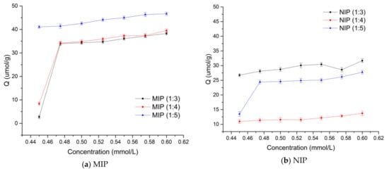 The adsorption properties of the MIPs and NIPs at the three different polymerization ratios were investigated through an equilibrium adsorption experiment (Figure 3).