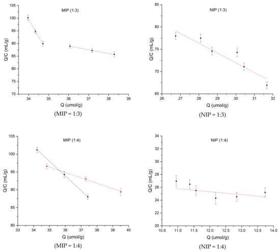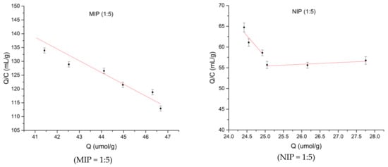 In accordance with Equation (3), the adsorption amounts and concentrations of the MIPs and NIPs obtained in Section 2.3.5 were calculated. The data from absorption are further processed with Scatchard analysis (see Figure 4).
