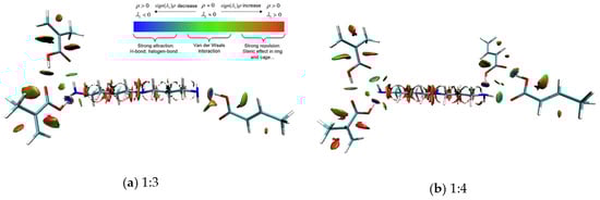 When mapping ρ(r) against the sign (λ2), there existed a three-dimensional isosurface distribution map of intermolecular weak interactions. Green represents van der Waals interactions, red represents the space repulsive and steric effect, and blue represents the electrostatic interactions and hydrogen bonds. Three-dimensional colored isosurfaces of the non-covalent interactions at the three ratios of SPD–MAA complexes are shown in Figure 5.