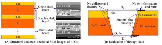 1]. Based on their structural and material characteristics, FPCs display many desirable properties, such as high reliability, flexibility, light weight and thinness. FPCs have been applied in various fields including the 3C products of the computer, communication and consumer electronics. The future trend of electronic products is light, thin, short and small. Therefore, it is necessary to process the FPCs with high density and quality interconnects. Microhole drilling is the main processing technology to obtain the interconnects in FPCs. There are strict requirements for the size and quality of the microholes drilled in FPCs, which directly determine the density and performance of interconnects.