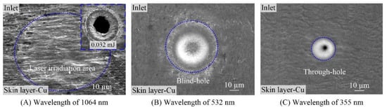 Figure 2A. The results showed that the 1064 nm wavelength was unsuitable for hole drilling in FPCs. Comparatively, few molten spatters and fine side-wall were observed for the holes ablated with the wavelengths of 532 and 355 nm, as shown in