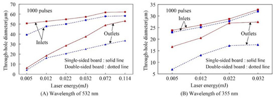 Figure 4. Specifically, the absorptions of Cu and PI at the wavelengths of 355 and 532 nm were measured using UVLS. Then, the absorptivities of Cu and PI were calculated and were 73.70% and 94.90% at the wavelength of 355 nm and 59.26% and 68.53% at the wavelength of 532 nm, respectively. Comparatively, the absorptivity of PI was significantly higher than that of Cu for the wavelength of 355 nm. Therefore, for the laser ablation in single-sided board with outlet layer of PI and the wavelength of 355 nm, the outlet diameter was more likely to reach saturation. Furthermore, for the double-sided board with the inlet and outlet layers of Cu and the middle layer of PI, based on the high absorptivity of PI at the wavelength of 355 nm, the middle layer PI was more liable to reach saturation. Then, the saturated middle layer PI could be regarded as an aperture with the convergence effect for the outlet diameter. Therefore, the outlet diameter was more liable to be saturated. In other words, for the microdrilling of through-holes ablated with the laser wavelength of 355 nm, the outlet diameter was more liable to reach saturation for the single-sided board with the outlet layer of PI and the double-sided board with the outlet layer of Cu. On the other hand, the absorptivities of both Cu and PI are similar at the laser wavelength of 532 nm, as shown in