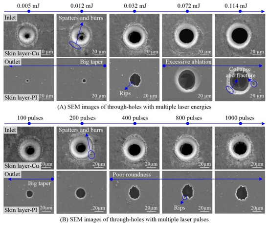 Figure 5A, when the laser energy was less than 0.012 mJ, the outlet morphology was very good but the outlet diameters were too small, which made the taper of holes too big. The through-holes with big taper could not meet the requirement of through-hole drilling in FPCs. By increasing the laser energy, the outlet diameter obviously became larger. Especially, when the laser energy was more than 0.072 mJ, the inlet and outlet diameters were similar and the taper of through-holes was small, or even zero. However, very high laser energy caused the excessive ablation and even the collapse and fracture on the surface of outlet. Overall, the outlet quality was better but the roundness was poor with some rips for the through-hole ablation with the energy of 0.032 mJ.
