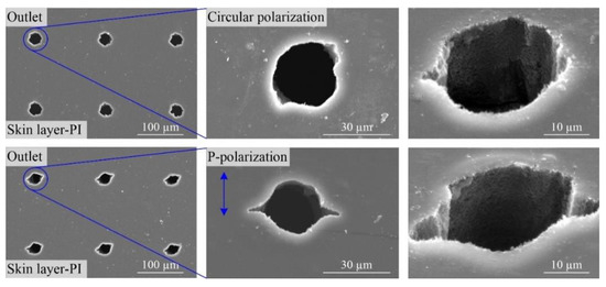 Figure 6. First, there were always rips for the laser drilling with both circular polarization and P-polarization. Second, for the drilling with the P-polarization, there were always two rips in a straight line except the other ones.