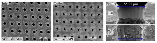 Figure 11. It can be seen that there was residual free space on the side-wall surfaces for both the Cu and PI layers. Also, there was no collapse and fracture at the Cu layer, the PI layer and especially the copper-dielectric interface. In other words, high quality side-wall surfaces were achieved in the large-area through-holes in FPCs ablated using picosecond ultrashort pulse laser. Moreover, the independence of the different layers was realized, thus achieving their respective functions.