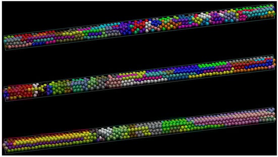 54] where linear, freely-jointed chains of tangent hard spheres of uniform size are generated and successively equilibrated under various conditions of confinement. The latter is realized through the presence of flat, impenetrable parallel walls in one or more dimensions. Extreme confinement corresponds to the state where inter-wall distance approaches monomer diameter leading eventually to the formation of quasi 1D (tube-like) and 2D (plate-like) polymer templates. Typical computer-generated polymer configurations can be seen in