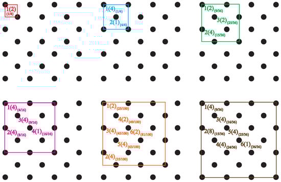 FCC lattice, origin types 1, 2, 3, 4, 5 and 6 are characterized by area ratios (overlaps) of