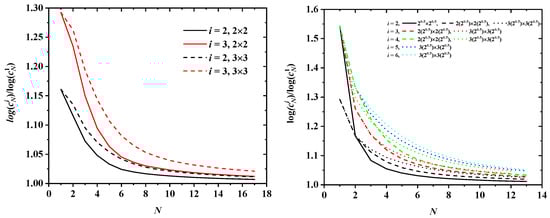 N increases for both SC (left panel) and FCC (right panel) lattices. Systematically, the ratio tends faster to unity for SAW origins that lie close in space and for smaller tube cross sections. For example, for an SAW of length