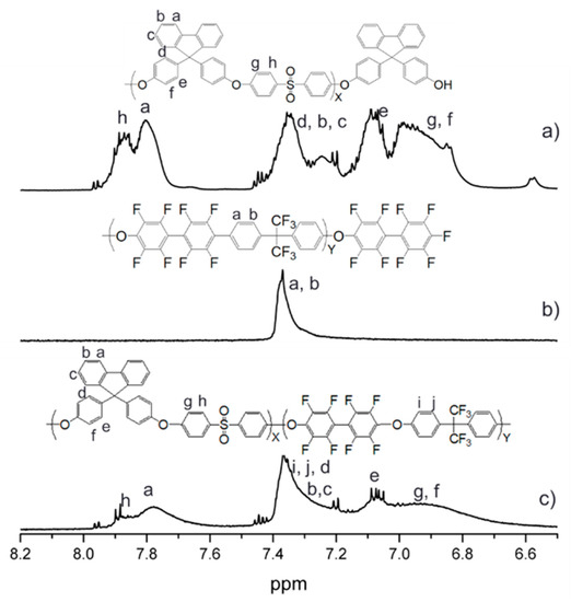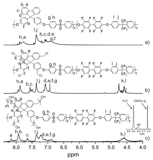 1H NMR of (a) PAES X10Y13, (b) CM-PAES X10Y13, and (c) QN-PAES X10Y13.