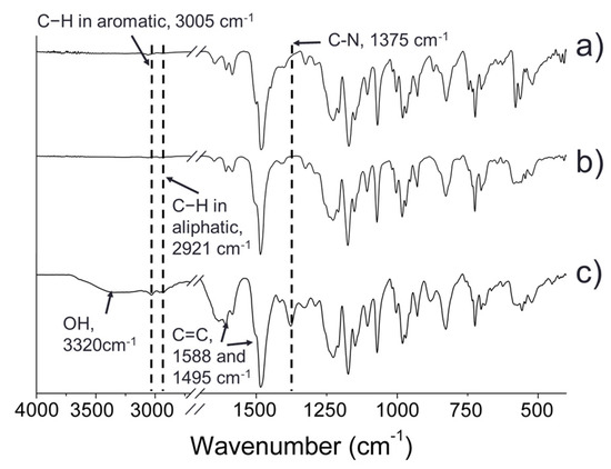 In addition, the introduction of chloromethyl functional groups and quaternary ammonium groups on the polymer backbone was confirmed by FT-IR spectra. As shown in Figure 4, all the polymers exhibited a characteristic peak corresponding to the vibrations of aromatic C=C double bonds on the benzene rings at 1588 and 1495 cm−1, and the characteristic peak at 3005 and 2921 cm−1 in Figure 4b,c was attributed to stretching vibrations of aromatic and aliphatic C−H bonds in methyl or methylene groups, respectively. Additionally, after quaternization with trimethylamine, the characteristic stretching of the C−N bond of the ammonium functional groups was observed at 1375 cm−1 in Figure 4c. This indicates the presence of quaternary ammonium groups in the polymer main chain. Therefore, these results demonstrate that chloromethyl groups and quaternary ammonium groups were introduced successfully to the polymer backbone.