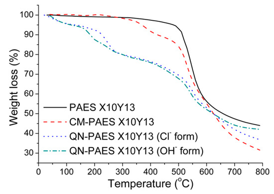 The thermal stability of the PAES X10Y13, CM-PAES X10Y13, and QN-PAES X10Y13 (Cl− form and OH− form) was evaluated by TGA analysis at a heating rate of 10 °C min−1 under a nitrogen atmosphere, and the results are shown in Figure 5. First, PAES X10Y13 was confirmed to be thermally stable through decomposition at over 500 ℃. The CM-PAES X10Y13 exhibited a first small weight loss corresponding to decomposition of chloromethyl functional groups at approximately 300 °C and a second weight loss corresponding to the degradation of main chains at 450 °C. The initial degradation of the QN-PAES X10Y13 (Cl− form and OH− form) block copolymer due to the residual organic solvent and tightly bound water molecules released in the membrane was induced below 120 °C, although the membranes were measured after completely drying. The second weight loss of the QN-PAES X10Y13 at 150–250 °C is related to the degradation of the quaternary ammonium groups. Finally, a third degradation around 400 °C, assigned to the decomposition of the polymer backbone TGA analysis of the synthesized polymers, show that the synthesized AEMs are well-suited for use as a commercial AEMs considering the alkaline fuel cell operating temperature is 80 °C.