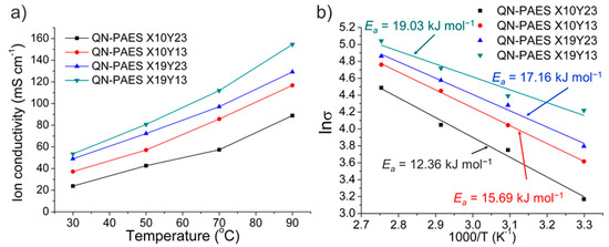 (a) The hydroxide conductivity of QN-PAES membranes and (b) Arrhenius plot of QN-PAES membranes at various temperatures under 100% RH.