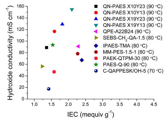 Hydroxide conductivity as a function of calculated IEC values’ comparison between recently reported AEMs.