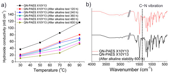 Apart from the high hydroxide conductivity and good thermal stability, alkaline stability is a major challenge for long-term use in alkaline fuel cells because AEMs based on quaternary ammonium groups have several drawbacks, such as degradation of the cationic groups under strong alkaline conditions. In this study, the alkaline stability of the QN-PAES membranes was evaluated by immersing the membranes in 2 M NaOH at 70 °C for 600 h. The hydroxide conductivity of QN-PAES X10Y23 and X10Y13 membranes (which maintained their appearance and flexibility) under these conditions was monitored, and the results are shown in Figure 11a and Figure S3, and Table S2. The hydroxide conductivity of membranes was assessed every 120 h interval up to 600 h. After the initial immersion in a 2 M NaOH solution at 70 °C for 120 h, the hydroxide conductivity of the QN-PAES X10Y13 membrane sharply decreased from 110.0 to 80.1 mS cm−1. Thereafter, the hydroxide conductivity of QN-PAES X10Y13 showed a slight decrease. Values were 69%, 60%, 55%, 49%, and 45% of the original hydroxide conductivity at intervals of 120 h, respectively. A comparison of FT-IR spectra before/after immersing membranes in a 2 M NaOH solution at 70 °C for 600 h is shown in Figure 11b. After the alkaline stability test, the absorption band at 1375 cm−1 and the stretching vibration of the C−N band tended to decrease, but there were no noticeable changes in the spectra. These results confirmed that the QN-PAES membranes are stable in the alkaline media, and are considered to be suitable for applications as AEMs.
