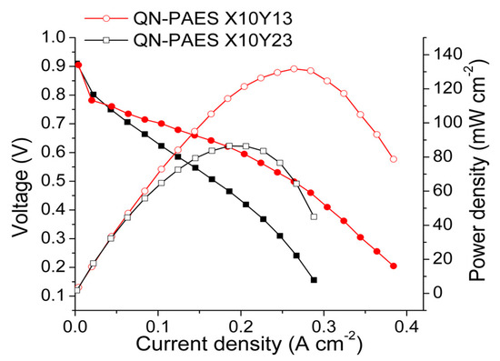 The representative QN-PAES X10Y23 and X10Y13 having a good balance between hydroxide conductivity and dimensional stability were used to measure fuel cell performance. The fuel cell performance of QN-PAES X10Y23 and X10Y13 was investigated at 60 °C under 100% RH with H2/O2 fuel gas. The polarization and power density curves of the prepared MEA are shown in Figure 12. The OCV of the MEAs was 0.9 V, which means that the prepared membrane has low fuel permeability. The maximum power density of QN-PAES X10Y13 (131.7 mW cm−2) with shorter hydrophobic oligomer length is 1.5 times higher than that of X10Y23. In addition, the current density of QN-PAES X10Y13 was 1.6 times higher than that of X10Y23 at 0.6 V. The high fuel cell performance of QN-PAES X10Y13 is attributed to high hydroxide conductivity. These results indicate that increasing the hydrophilic oligomer length enhances the mobility of the ions, thereby improving the electrochemical properties. The maximum power density of the prepared MEA was high compared to the previous studies [56,57,58]. Therefore, considering the electrochemical performance and physical properties of the prepared QN-PAES X10Y13 membrane, it is considered to be an excellent candidate for an alkaline fuel cell.