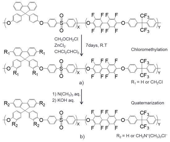 4,4′-(9-Fluorenylidene)diphenol (BPFL), bis(4-fluorophenyl)sulfone (FPS), chloromethyl methyl ether (CMME), anhydrous N,N-dimethylacetamide (DMAc), anhydrous toluene, and dimethyl sulfoxide-d6 (DMSO-d6) were purchased from Sigma-Aldrich (Saint Louis, MI, USA). 4,4′-(Hexafluoroisopropylidene)diphenol (6F-BPA), decafluorobiphenyl (DFBP), and 45 wt % trimethylamine aqueous solution were purchased from Alfa Aesar (Haverhill, MA, USA). The zinc chloride (ZnCl2), potassium carbonate (K2CO3), 1,1,2,2-tetrachloroethane (TCE), tetrahydrofuran (THF), methanol, and acetone were of reagent grade.