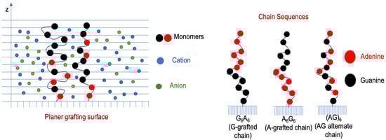 The theoretical model in this work is developed to represent surface-grafted ssDNA oligomers as a co-polymer with two monomer units, adenine (A) and guanine (G), at a coarse-grained level. We explicitly consider the physical and chemical properties of these nucleobases in a solution environment to capture their behavior as accurately as possible. We study three chain sequences: the diblock co-polymer of A and G with the A-end grafted to the surface (AG, a block of six adenine monomers followed by a block of six guanine monomers), the diblock of A and G with the G-end grafted to the surface (GA, a block of six guanine monomers followed by a block of six adenine monomers), and an alternating sequence of A and G ((AG), one adenine monomer followed by a guanine monomer in an alternating manner) (Figure 1). Each of these chains contains 12 monomers at varying grafting densities and MgCl concentrations, while keeping the solution temperature and background NaCl concentration fixed at 298 K and 10 mM, respectively. NaCl is added to the system to comply with the relevant experimental study by Holland et al. [], which hypothesizes that Mg might replace Na in a probable binding pathway.