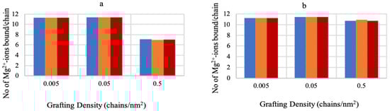 Figure 2a,b shows the number of bound Mg with AG, GA and (AG) sequences at different grafting densities for 3 mM and 180 mM MgCl content. The data in both plots demonstrate that, despite the sequence heterogeneity and variation on the grafting ends, all three sequences bind similar amounts of Mg ions at different grafting densities and salt concentrations, except for the 0.5 chains/nm and 3 mM condition. The relatively low cation binding at this condition can be attributed to the unavailability of enough Mg ions at the low concentration of the MgCl salt and high grafting density of the polymer chains. These results are in agreement with the experimental findings that Mg ions do not aggregate around the strongest binder (guanine), and are uniformly distributed throughout the length of the chains []. This agrees with the notion that non-specific interactions due to the electrostatics of the sugar-phosphate backbone dominating the ion binding to the ssDNA chains, as the non-specific part of the free energy for adenine and guanine ( KJ/mol, from Holland et al. []) is much higher than the specific part of the free energies ( KJ/mol and KJ/mol, respectively, from Holland et al. []), and the specific free energies are all within a few KJ of each other, hence making the ion binding less distinctive.
