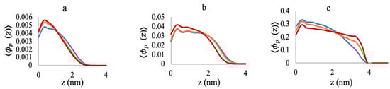 Although at first glance, the collapse does not seem to be very prominent, it is significant for the length scales of the polyelectrolytes in our system (chain length of only 12 monomers). However, for higher grafting density (Figure 3b), the peak is less distinctive at 3 mM and 50 mM MgCl concentrations than 180 mM and nearly plateaus down from 0.8 nm–2 nm. Herein, the high grafting density creates steric repulsion, and the system faces a competition between charge screening and steric repulsion to stabilize the polyelectrolyte structures. At the low MgCl salt concentrations (3 mM and 50 mM), the system energetically favors chain stretching to accommodate both charge repulsion and steric hindrance. However, when we further increase the MgCl salt concentration to 180 mM, charge screening by the Mg ion dominates over the steric repulsion, and we get a distinct chain collapse near the grafting surface. Figure 3c corresponds to the volume fraction profiles of the polyelectrolyte chains at high grafting density ( chains/nm) and shows a clearly opposite picture than Figure 3a,b, with the chains stretching, while we increase the salt concentration. In this case, at 3 mM MgCl, the number of the bound Mg ions is sufficient for mitigating the charge repulsion inside the brush. A further increase in the salt concentration induces additional steric hindrance due to the volume exclusion, and the chains pay in conformational entropy to stretch the chains and accommodate more Mg ions inside the brush. This phenomenon of polyelectrolyte chain stretching with increasing counterion concentration is well known as the “re-entrant phenomena” and has been experimentally verified by several studies [,].