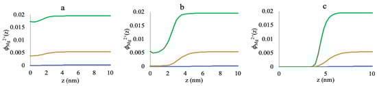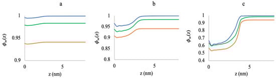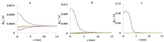 Figure 10 depicts the volume fraction profiles of free Na ions as a function of distance from the grafting surface at varying grafting densities with the presence of varying concentrations of MgCl salt. When there is no MgCl salt present (the blue lines in the plots in Figure 10a–c), the NaCl salt in the system solely contributes to the charge neutralization inside the oligomer brushes, and hence, the volume fractions of the Na ions in the brush layer are very high compared to the bulk. However, as we add the MgCl salt in our system, the divalent Mg ions displace the Na ions, and we see a significant reduction in the volume fractions of the Na ions inside the brush at all the grafting densities and all the concentrations of the MgCl salt. At the low grafting density (Figure 10a), we still see a considerable amount of the Na ions inside the chain region, due to low steric repulsion inside the brush. Nevertheless, for higher grafting densities of the chains (Figure 10b,c), almost all the Na ions are replaced by the divalent Mg cations at all the MgCl salt concentrations. These results theoretically support the hypothesis from the relevant experimental study by Holland et al. [], which states that Mg displaces Na through a possible binding pathway with surface-grafted ssDNA oligomers.