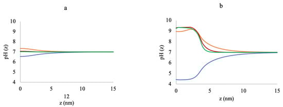pH profiles along the distance from the grafting surface at (a) chains/nm and (b) chains/nm for 0 mM (blue lines), 3 mM (yellow lines), 50 mM (red lines), and 180 mM (green lines) MgCl concentrations.