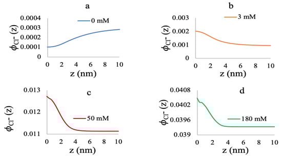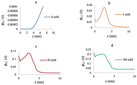 Chloride volume fractions at chains/nm for 0 mM (a), 3 mM (b), 50 mM (c), and 180 mM (d) MgCl concentrations.
