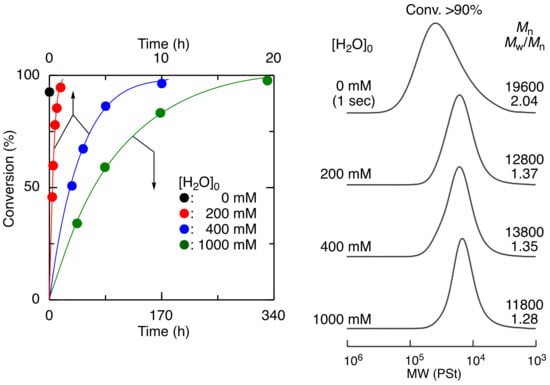 Effects of water on the controlled/living cationic polymerization of 4VG in CH3CN at 0 °C; [4VG]0/[pMOS-OH]0/[BF3·OEt2]0/[H2O]0 = 200/4.0/2.0/0, 200, 400, or 1000 mM.