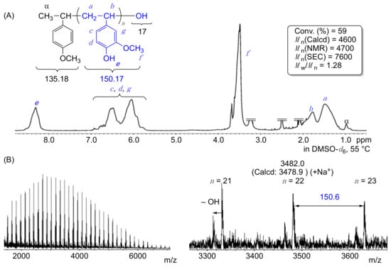 1H NMR (A) and MALDI-TOF-MS (B) spectrum of poly(4VG) obtained with 1/BF3·OEt2 in CH3CN at 0 °C in the presence of water; [4VG]0/[1]0/[BF3·OEt2]0/[H2O]0 = 200/4.0/2.0/1000 mM.