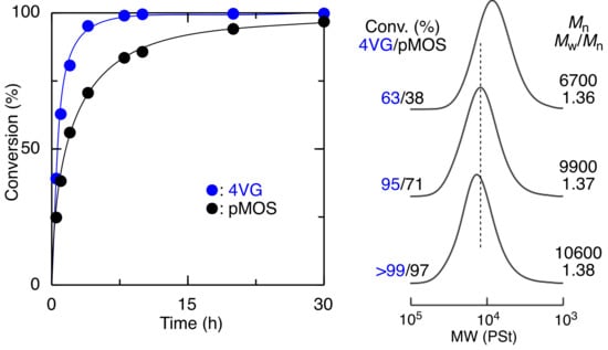 Based on the success of the direct-controlled/living cationic polymerization of 4VG in the aqueous system, we then studied random/statistical and block copolymerization of 4VG. Herein, pMOS was employed as the comonomer, which is a cationically polymerizable and more hydrophobic styrene derived from petrochemicals, to prepare various types of 4VG-derived phenolic polystyrene copolymers [].