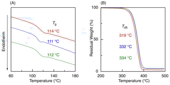 1H NMR spectra were recorded on a JEOL ECS-400 spectrometer (JEOL, Tokyo, Japan) operated at 400 MHz. The number-average molecular weights (Mn) and molecular weight distributions (Mw/Mn) of the product polymers were determined via size-exclusion chromatography (SEC) in DMF containing 100 mM LiCl at 40 °C on two hydrophilic polymer gel columns [Tosoh α-M + α-3000 (7.8 mm i.d. × 30 cm) (Tosoh Corporation, Tokyo, Japan); flow rate of 1.0 mL/min] (for poly(4VG)) connected to a JASCO PU-2080 precision pump and a JASCO RI-2031 detector (JASCO, Tokyo, Japan). The columns were calibrated against standard polystyrene samples (Agilent Technologies, Santa Clara, CA, USA; Mp = 580–3,053,000, Mw/Mn = 1.02–1.23). The glass transition temperature (Tg) of the polymers was recorded on a Q200 differential-scanning calorimeter (TA Instruments, Inc., New Castle, DE, USA), and the Tg values were obtained from the second scan after removing the thermal history. The samples were first heated to 210 °C at 10 °C/min, equilibrated at this temperature for 10 min, and cooled to −60 °C at 5 °C/min. After holding at this temperature for 5 min, the samples were then reheated to 210 or 260 °C at 10 °C/min. The thermogravimetric analyses (TGA) were performed on a Q500 system (TA Instruments Inc.) at 5 °C/min under a N2 gas flow.