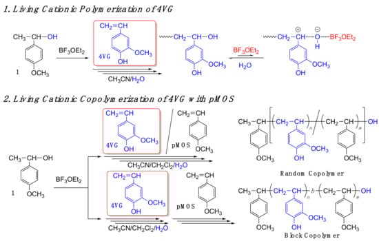 4-Vinylguaiacol (4VG) (Aldrich, St. Louis, MO, USA, >98%) and p-methoxystyrene (pMOS) (4-vinylanisole; Aldrich; 97%) were distilled under reduced pressure before use. The water adduct of pMOS (1: 4-methoxy-α-methylbenzyl alcohol (Aldrich; 99%)) was distilled over calcium hydride (2 mmHg, 110 °C) before use. BF3·OEt2 (Aldrich; purified, redistilled) and acetonitrile (CH3CN) (FUJIFILM Wako Pure Chemical Corporation, Osaka, Japan, H2O < 50 ppm) were used as received. Dichloromethane (CH2Cl2) (KANTO, Tokyo, Japan, >99.5%; H2O < 0.005%) was deoxygenized and dried by passing through a column from Glass Contour Systems (Glass Contour, Nashua, NH, USA) before use. Distilled deionized water was used for the polymerizations without degassing. Acetic anhydride (TCI, Tokyo, Japan, >99%) and pyridine (TCI, >99%) were used as received.