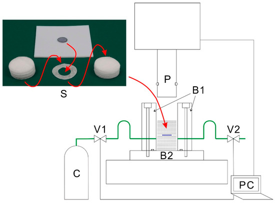 In the CAPC process, the piston (P) was first lowered to a certain distance from the bottom of the pressure vessel (B2). CO2 was introduced by vapor pressure at a position 1.5 times higher than the press position. The piston and pressure vessel were sealed with the O ring provided on the side of the piston. Because the CO2 cylinder (C) connected to the pressure vessel was below the position of the O ring, the CO2 introduced into the pressure vessel struck the piston and was supplied to the sample through the gap between the piston and pressure vessel. Subsequently, the introduction and discharge of CO2 were repeated three times before replacing air with CO2. The piston was lowered to the press position and the sample were pressed for 10 s. After the vessel was evacuated by opening the exhaust valve (V2), the piston was raised and the sample taken out. Because the CAPC process compressed the sheets at the press position, the thickness of the fabricated porous material was almost equal to this position.