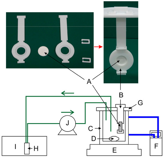 Schematic illustration of the set-up for drug release evaluation. A: Sample, B: Sample holder, C: Jacketed beaker, D: Stirrer bar, E: Magnetic stirrer, F: Circulating water bath, G: Beaker cap, H: Quartz flow cell, I: UV/vis spectrophotometer, and J: Peristaltic pump.