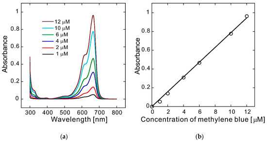 First, validation of the concentration measurement and calibration of the absorbance against concentration were carried out. The observed spectra of methylene blue in the MES buffer solution at steady-state condition are shown in Figure 3a. The linear relationship between the absorbance at 664 nm and methylene blue concentration was maintained up to a concentration of 12 μM (Figure 3b).