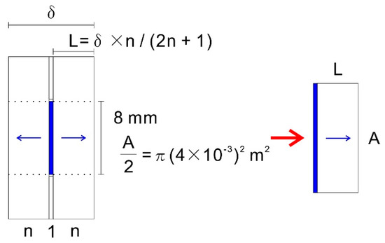 The effective diffusion coefficient in the porous material (Deff) of the tablet was investigated by constructing a diffusion model. In this model, the state after delay time m3″ associated with the initial penetration of water, as seen in the experiment, was set to time 0. In addition, to simplify the model, unidirectional diffusion behavior in a porous material with an area twice the elution cross-section was assumed instead of gradual release of the drug at the center from both sides of the tablet (Figure 6). The thickness of the diffusion layer (L) was calculated from the number of sheets (n) on each side, total number of sheets (2n + 1), and sample thickness δ, assuming that the overlapping nonwoven fabrics are evenly compressed (Figure 6).