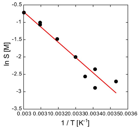Van’t Hoff plot of solubility S of methylene blue in 1 mM MES buffer solution.