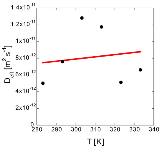 Temperature dependence of Deff. The circles are experimental data, while the red solid line is the proportional fitting.