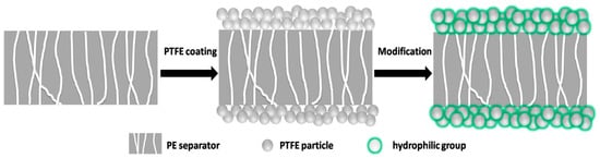 A commercial PE separator (Tonen, thickness = 12 μm, F12BMS, Tokyo, Japan) was washed with acetone and dried at 50 °C for 12 h prior to use. A 60% content PTFE suspension from Sigma-Aldrich Company (Saint Louis, MO, USA) was adopted to coat the PE separators. Prior to the coating process, the suspension was diluted with deionized water to a solid content of 20 wt % under ultrasonic assistance. The fabrication of the composite separator was done by two main procedures following the scheme shown in Figure 1. First of all, the dilute suspension was applied onto both sides of the PE separators via a dip-coating process. The PTFE-coated separator was dried in a vacuum oven at 80 °C for 24 h. In order to enhance the electrolyte affinity of the PTFE coating layer, a milder chemical modification that avoided damaging the mechanical strength of the PTFE-coated separator was then adopted from Löhbach and Bakowsky [22]. The PTFE-coated separator was impregnated into a H2O2 (30%, Sinopharm Chemical Reagent Co., Ltd., Shanghai, China)/H2SO4 (98%, Sinopharm Chemical Reagent Co., Ltd., Shanghai, China) (1:1) solution and left at 50 °C for 30 s. Next, the separator was flushed with deionized water, followed by acetone, and then dried at 60 °C in a nitrogen atmosphere. The treated PTFE-coated separator was abbreviated as trPTFE-coated separator. The final thickness of the trPTFE-coated separator was measured to be around 18 μm.