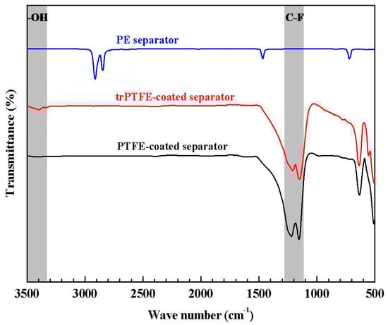 FT-IR spectra of the PE separator, the PTFE-coated separator, and the trPTFE-coated separator.