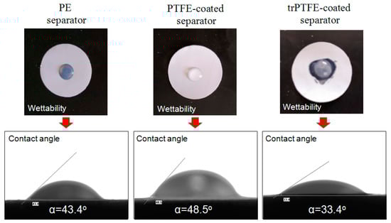 The wetting behavior of the separators was investigated using a liquid electrolyte absorption test. The corresponding static electrolyte contact angle is shown in Figure 4 and also listed in Table 1. As can be seen in Figure 4, the liquid droplet remained steady on the PE separator for a few minutes, and the PTFE-coated separator was hardly wetted by the liquid electrolyte due to the strong hydrophobicity of the unmodified PTFE layer. In contrast, the trPTFE-coated separator soaked up a portion of the electrolyte immediately, where the electrolyte droplet could easily spread over surrounding area. Because the separator pores were filled with the electrolyte, the trPTFE-coated separator became partly transparent. The static electrolyte contact angle test results were similar to the electrolyte absorption test. In comparison with the contact angle (43.4°) of the PE separator, that of the PTFE-coated separator was observed to be 48.5°, while the contact angle of the trPTFE-coated separator was significantly decreased to 33.4°. These results demonstrate that the improvement in the electrolyte wettability of the trPTFE-coated separator is remarkable, owing to the milder chemical modification. This result also verifies the change in the surface groups of the PTFE coating layer before and after the modification, as mentioned in Figure 3. The electrolyte uptake is a more straightforward parameter of wettability for separators used in batteries. The electrolyte uptake of the trPTFE-coated separator was more than 190%, which was clearly higher than that of the PE separator and that of the PTFE-coated separator (Table 1). It can be concluded that the trPTFE-coated separator exhibited outstanding electrolyte wettability, owing to its well-defined porous structure and its surface hydrophilicity, as verified above.