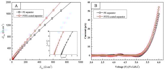 (A) Nyquist plots of the cells with the PE separator and the trPTFE-coated separator. The insert is the partial enlarged drawing; (B) The linear sweep voltammogram of the cells with the PE separator and the trPTFE-coated separator.