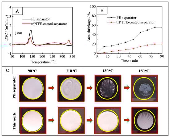 (A) DSC curves of the PE separator and the trPTFE-coated separator; (B) Thermal shrinkage of the separators as a function of time at 130 °C; and (C) Photographs of the separators after being exposed to 90, 110, 130, and 150 °C for 0.5 h, respectively.
