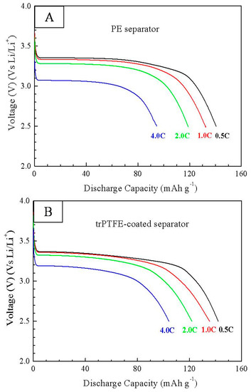 Figure 7 shows the C-rate capability of the cells with the PE separator and the trPTFE-coated separator. The discharge capacity of both cells gradually decreased with an increase of the discharge current density. No unstable discharge phenomenon was observed for the trPTFE-coated separator. Moreover, the discharge capacity of the trPTFE-coated separator (141.9 mAh/g at 0.5 C) appeared to be a little higher than that of the PE separator (140.3 mAh/g at 0.5 C). When the discharge current was increased to a 4.0 C rate, the advantage of the trPTFE-coated separator in the discharge C-rate capacity became more pronounced. The discharge C-rate capacity of the trPTFE-coated separator was 104.2 mAh/g at 4.0 C, which was much higher than that of the PE separator (94.5 mAh/g at 4.0 C). These results demonstrate that the cell assembled with exhibited better C-rate capability than that of the PE separator, which reveals that the trPTFE-coated separator’s higher ionic conductivity due to its porosity and wettability could be beneficial in improving its discharge C-rate capability.